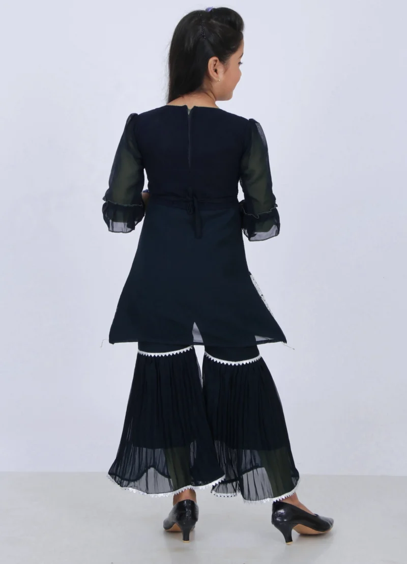 Dress your little girl in this royal Black Embroidered Sharara Set — a perfect ethnic outfit designed for girls aged 5 to 10 years. This traditional-style top and bottom set features intricate thread and sequin embroidery, giving a designer lehenga choli look with the comfort of a sharara suit.
