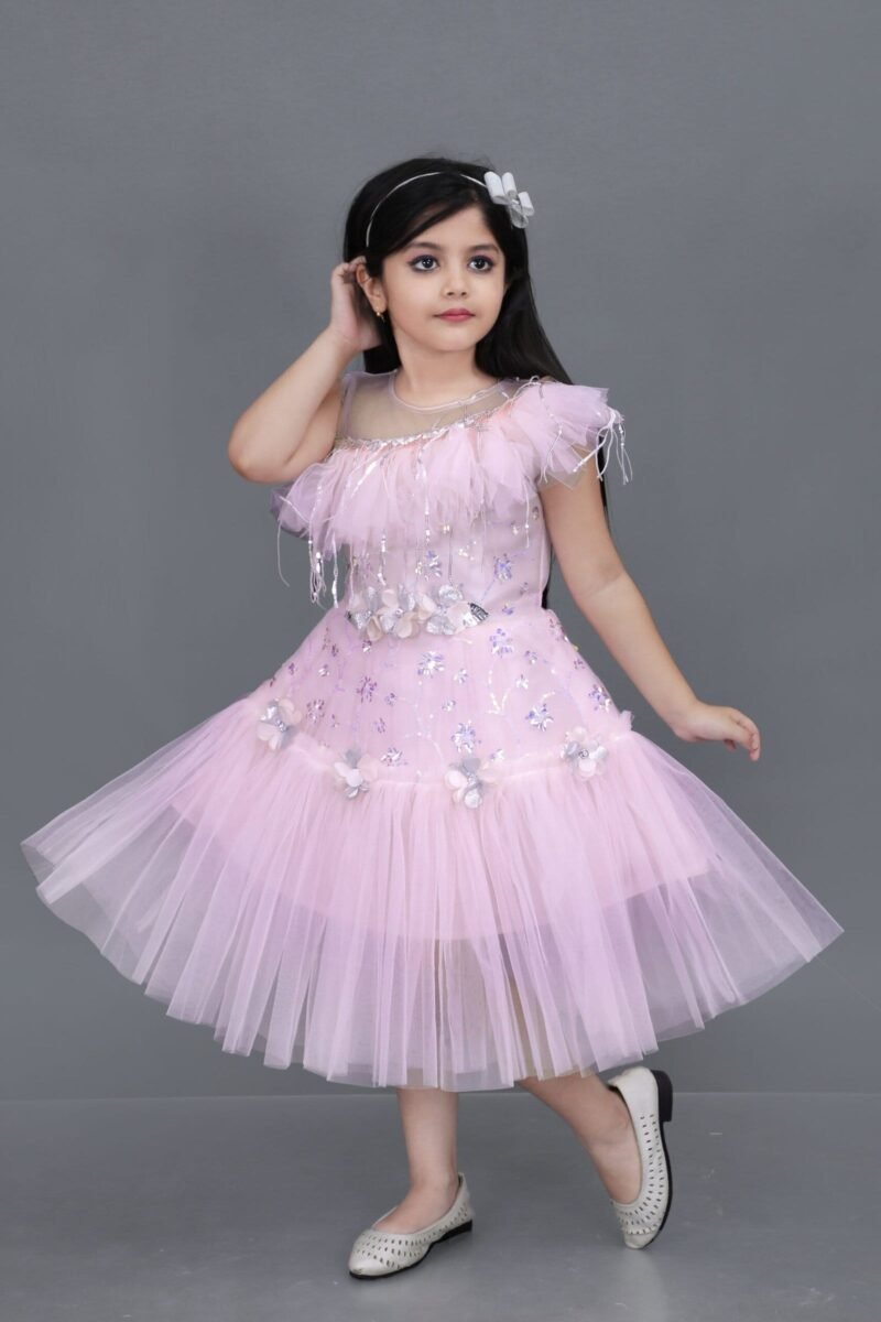 Make your little princess shine with this adorable lavender net frock designed for special occasions. Featuring a soft net overlay, this knee-length frock is adorned with delicate 3D floral appliqués and glittering embellishments that add a magical charm. The layered flared design gives it a fairy-tale look, perfect for birthdays, weddings, and festive events. The soft inner lining ensures all-day comfort, while the off-shoulder design enhances the elegance.
