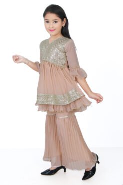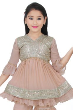 Dress your little one in timeless elegance with this peach embroidered kurti and sharara set. The outfit features a beautifully detailed kurti with gold thread and sequin embroidery, paired with a matching flared sharara. Made from soft georgette fabric, this ensemble is both comfortable and festive. The layered frill design and ruffle sleeves add charm and grace, making it perfect for weddings, birthdays, and special celebrations.