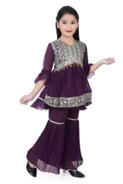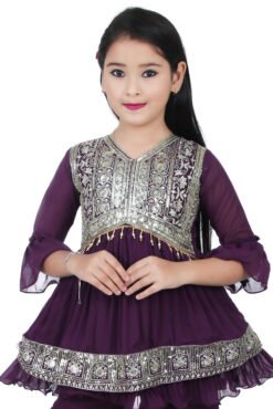 Elegant purple kurti and sharara set with mirror and zari embroidery. Perfect ethnic outfit for weddings and festivals. Sizes 5 to 12 years available. Shop now!