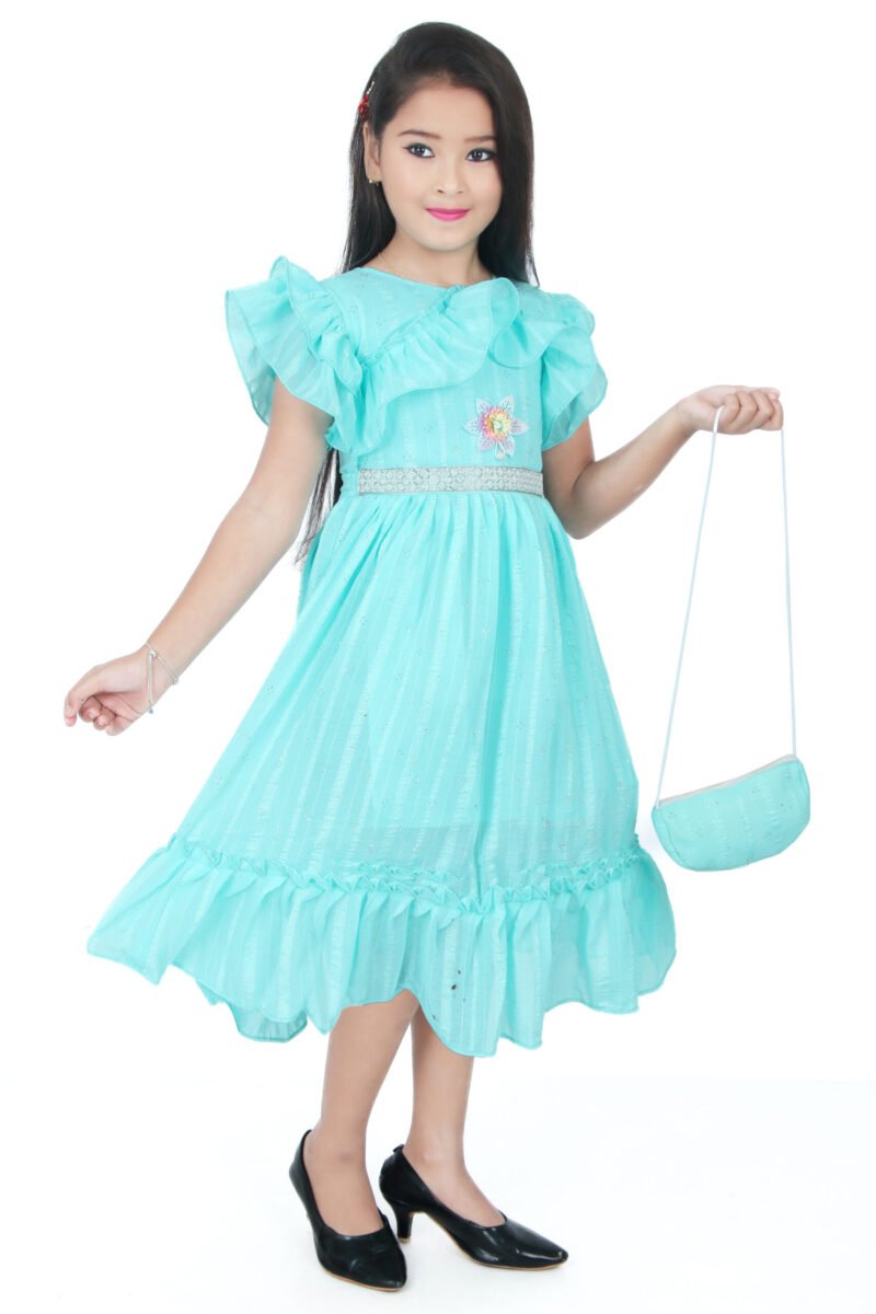 Explore this gorgeous sky blue frill frock for girls, paired with a matching handbag. Perfect party wear for girls aged 4 to 10 years. Add charm to her wardrobe today!