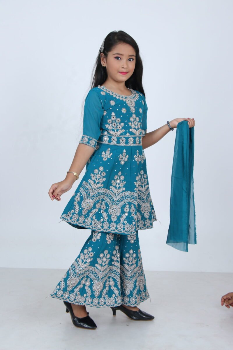 Add elegance to your little one’s wardrobe with this stunning teal ethnic set. Featuring intricate golden embroidery on a flared top and matching sharara-style bottoms, this outfit is ideal for festive occasions, weddings, and cultural functions. The set is made of soft, high-quality fabric that ensures comfort while looking stylish. It includes a matching teal dupatta that completes the traditional yet trendy look.