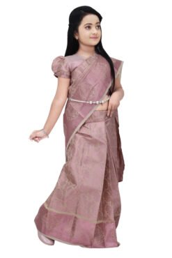 Dress your child in elegance with our Banarasi Silk Saree in pink and gold. Comes with blouse and pearl belt. Ideal for weddings and functions. Sizes 5–12 years.