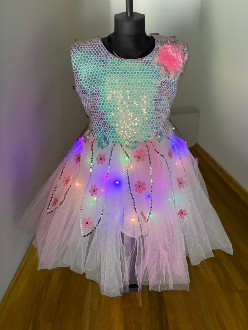 Dress your little one in this enchanting Girls’ Multicolor LED Light-Up Net Frock designed for girls aged 1 to 8 years. This frock is a perfect blend of elegance and modern flair, featuring a beautifully handcrafted design adorned with a variety of colors and delicate details. The frock is sleeveless, offering a comfortable and stylish fit, and comes with a convenient back zipper for easy wear.
