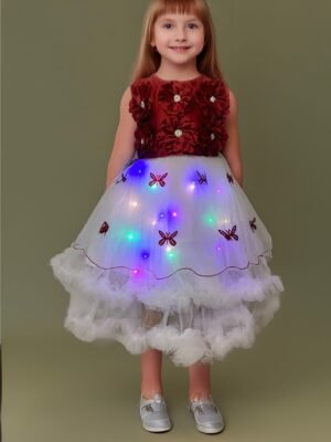 Lighting Dress Girls Red and White Long Net Frock Butterfly Design