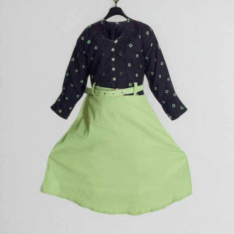 Women Long Shirt Dress Cuffed Straight Sleeves Green Color Balck body color printed