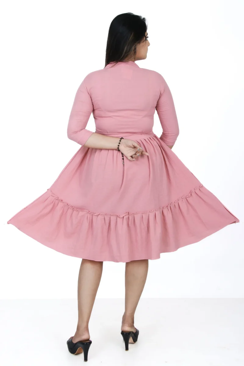 Step into timeless elegance with this exquisite dark red long kurti dress, a masterpiece crafted for the modern woman who cherishes tradition with a twist. The deep, captivating dark red shade evokes a sense of regal allure, making this kurti a standout piece in any wardrobe. Designed with a delicate floral embellishment on the chest, it whispers sophistication and charm, drawing the eye to its intricate details. The three-quarter sleeves lend a contemporary edge, while the button-down front and a matching tie-up waist belt create a silhouette that’s both flattering and graceful. What truly sets this kurti apart is its flared, tiered hemline—a design that flows effortlessly, adding a playful yet elegant touch to your every move. Made from a soft, breathable fabric, this kurti ensures you stay comfortable whether you’re attending a festive gathering, a casual day out, or a family celebration. This dark red long kurti dress with floral design is more than just clothing—it’s a celebration of style, culture, and individuality. Pair it with your favorite accessories and let this kurti transform you into a vision of ethnic elegance with a modern flair, perfect for any occasion that calls for grace and poise.